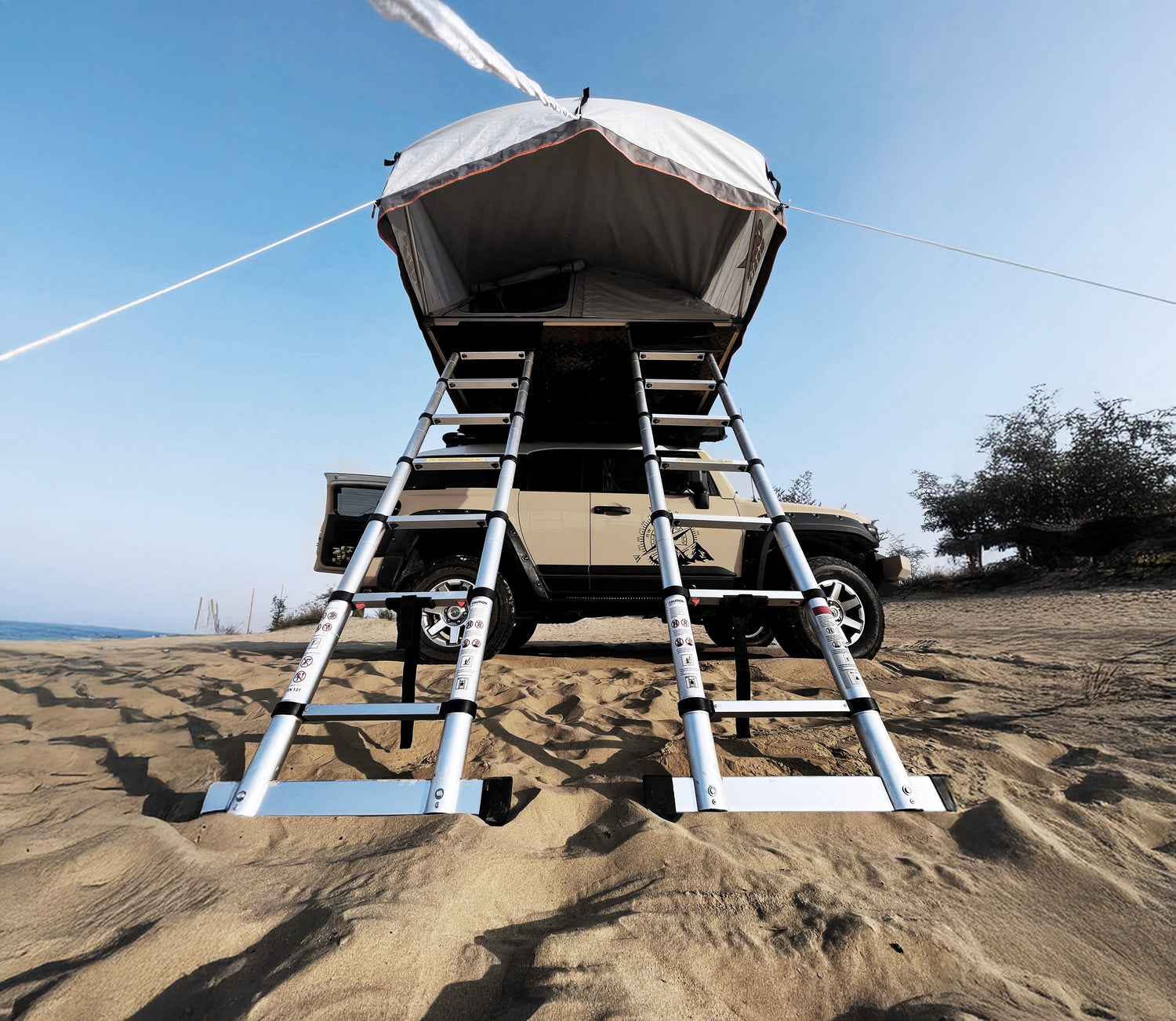 Our tent stands among the largest in the market, offering unmatched space and comfort for families and adventurers alike. It features two unique telescopic aluminum ladder with a wide, non-slip base specially engineered to stay stable even on soft desert sand. The private entrance ensures easy access and added privacy, making every camping experience more comfortable and secure.