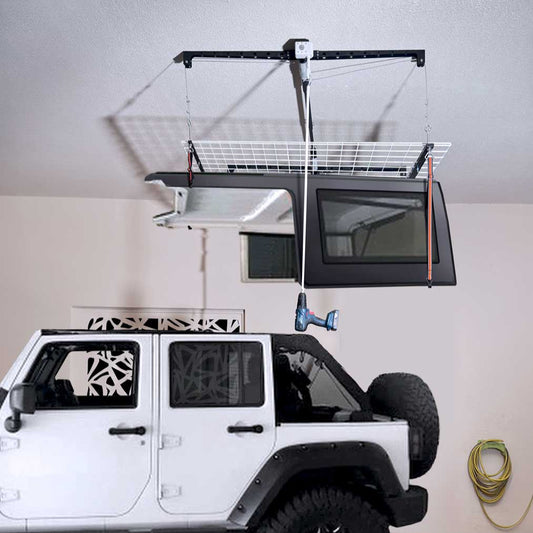 OVERHEAD GARAGE STORAGE RACK, CEILING-MOUNTED PULLEY LIFT SYSTEM