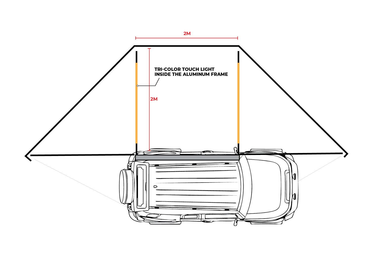 The OBK 180º Awning is available in 2.0 m sizes, providing wide coverage around your car or trailer for shade, cooking, and relaxing. Long LED light strips are neatly built inside the durable aluminum frame, ensuring strong performance, clean lighting, and reliable use on every adventure.