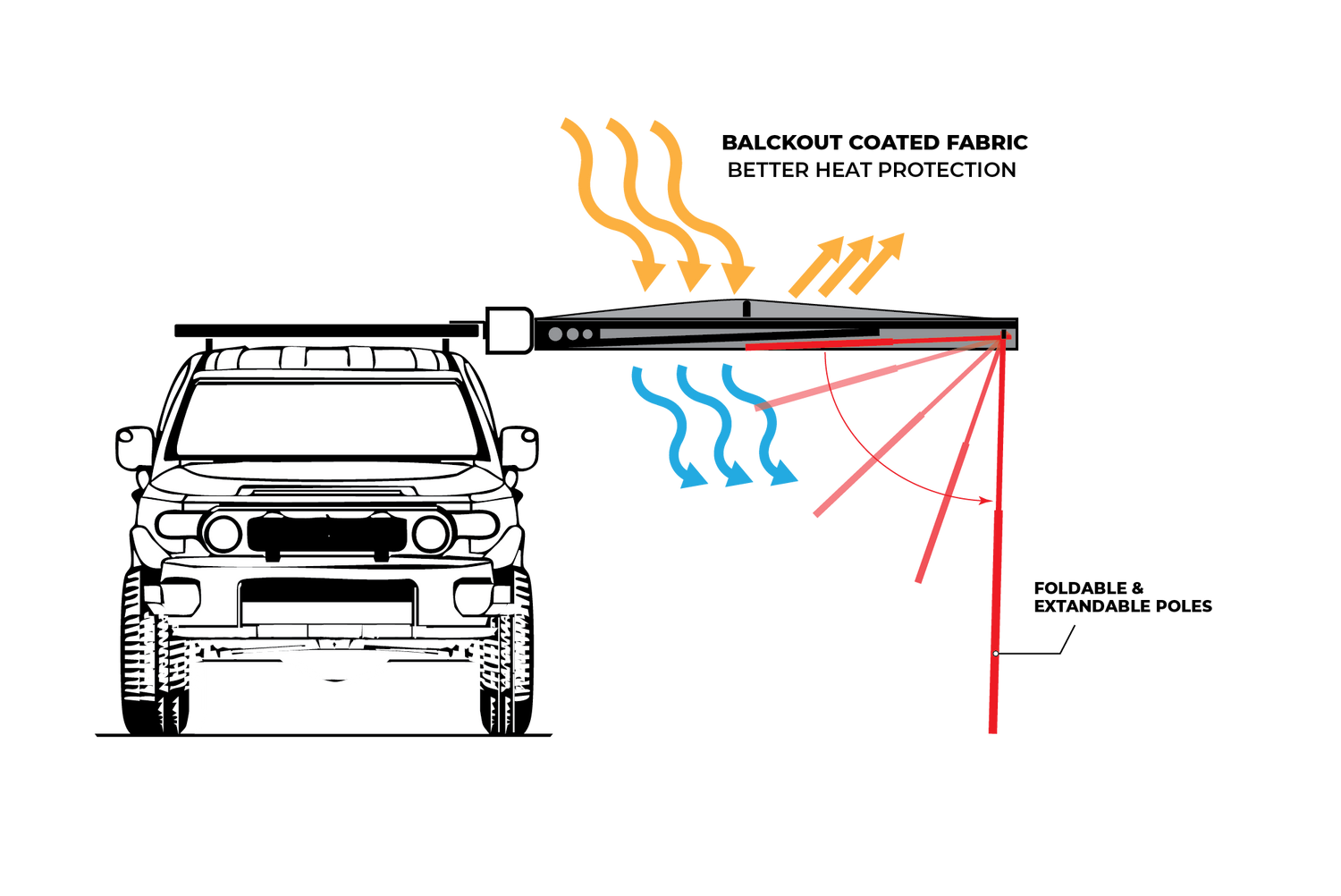 The blackout-coated fabric reduces heat and blocks strong sunlight to keep your shaded space more comfortable. The awning can be used with or without the attached support poles, giving you fast setup and flexible stability wherever you park.